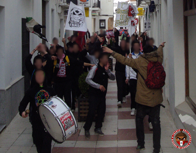 Pasamos a relatar lo sucedido, un poco en forma de 'crónica' de viaje, y un poco en forma de 'comunicado. Desplazamiento en coches de 50 seguidores desde bien temprano, con la intención de pasar un buen día todos juntos por Llerena. Cuando apenas quedaba media hora para el partido, decidimos movilizarnos hasta el centro de la localidad, para ir todos juntos en corteo hasta el estadio. Errónea decisión, pues llegamos al campo con el partido empezado, lo que conllevó que ni pudieramos sacar el tifo que teníamos preparado, ni pudieramos colgar todas las pancartas de forma adecuada, como se ve en las fotos.